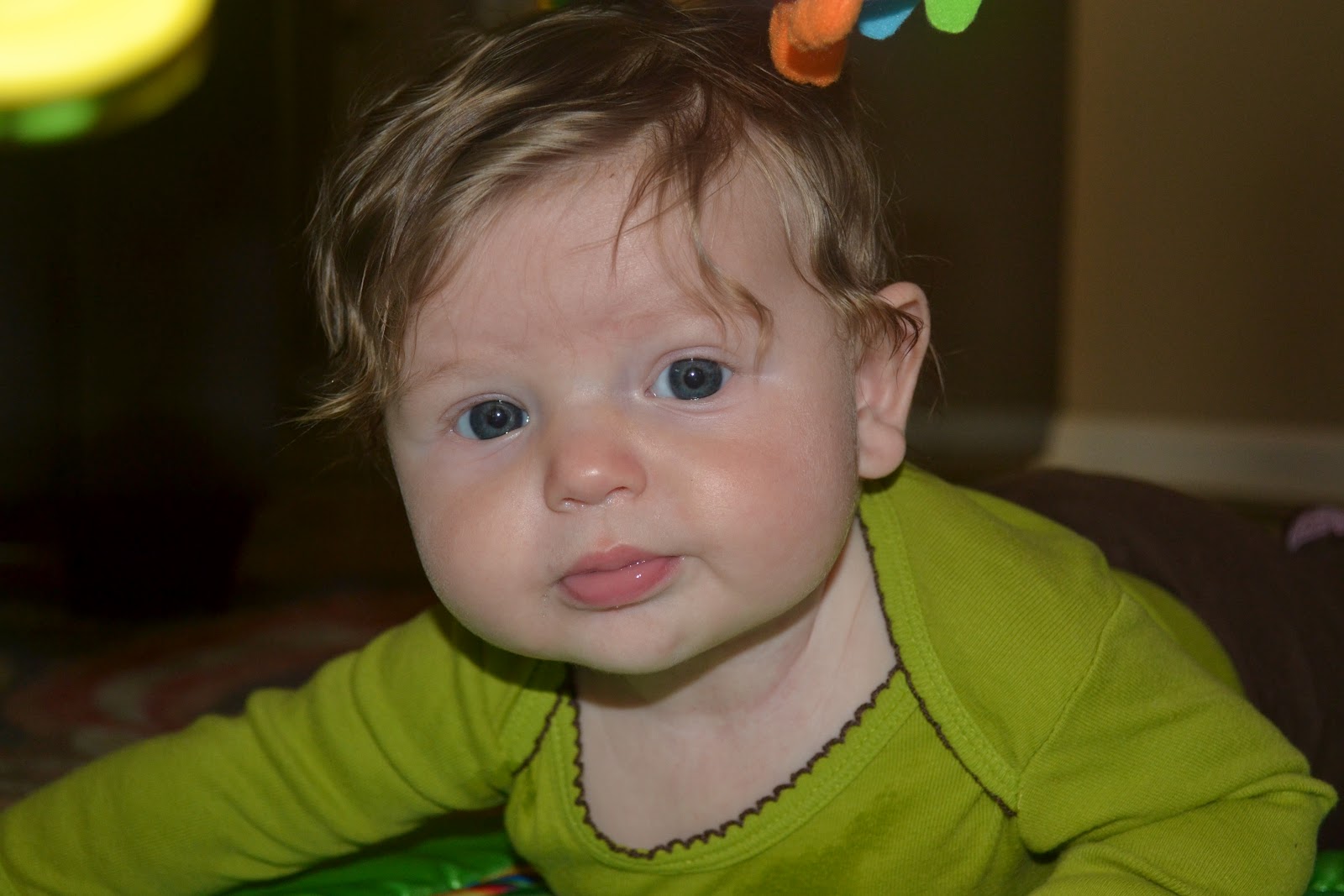You have started laughing! Oh how I love that sound! I can usually get one by kissing your neck. You just love sitting and watching your family and are generally content as long as we don't leave you alone in a room.